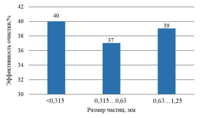 Полученные результаты показали, что использование частиц различных фракций обеспечивает эффективность очистки от 35 до 40 % (рис. 2). При этом максимальное значение – 40 % достигнуто при использовании частиц ТКШ500 размером менее 0,315 мм.