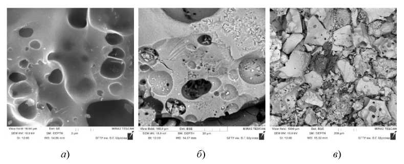 Рис. 2. Микрофотографии частиц золы при размере фракций, мкм: а – 1…10; б – 1…100; в – 1…1000
