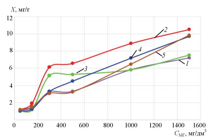 Десорбцию проводили дистиллированной водой (Т : Ж = 1 : 100) при времени установления равновесия 48 ч. Высвобождение МГ зависит от рН
