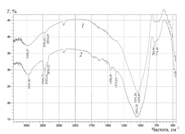 Рис. 4. ИК-спектры сорбционного материала до сорбции красителя МГ (1) и после (2)