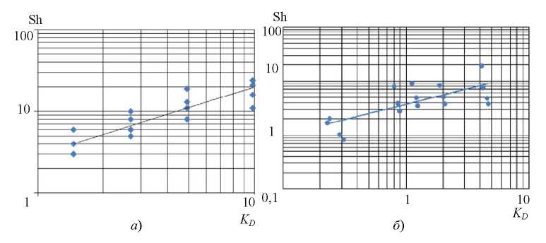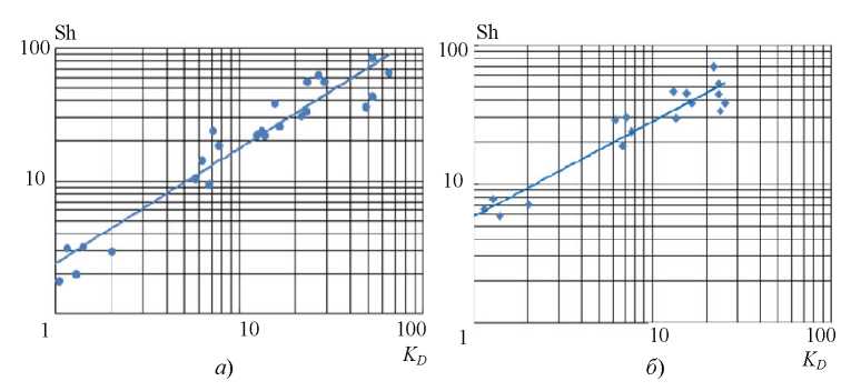 Результаты обработки данных по локальным значениям абсорбции двуокиси углерода СО2 в пленке пресной воды в широком диапазоне изменения критериев Reг, Reпл показаны на рис. 2, а; по средним значениям абсорбции – рис. 2, б. Критерий представляет собой комплекс критериев