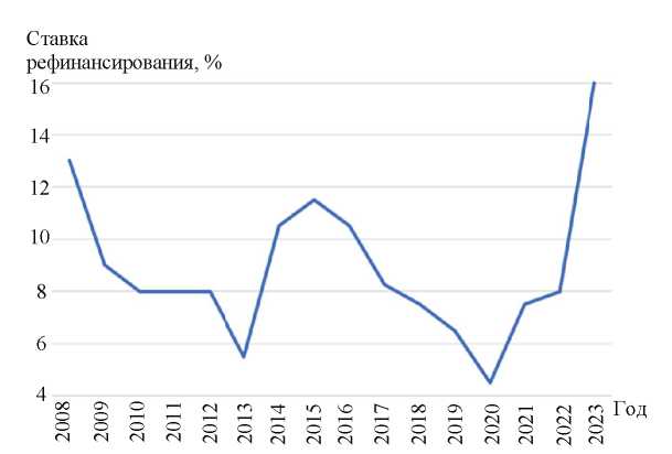 Рис. 1. График динамики ставки рефинансирования за 2008 – 2023 гг.