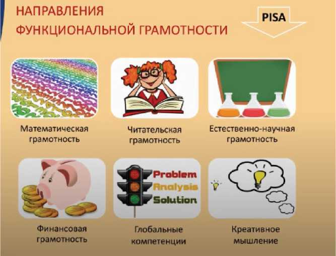 Рассмотрим направления функциональной грамотности. Согласно исследованию Pisa, существуют следующие виды: математическая, читательская, естественнонаучная и финансовая грамотность (в первоначальных исследованиях), а позднее – глобальные компетенции и креативное мышление (рис. 1).