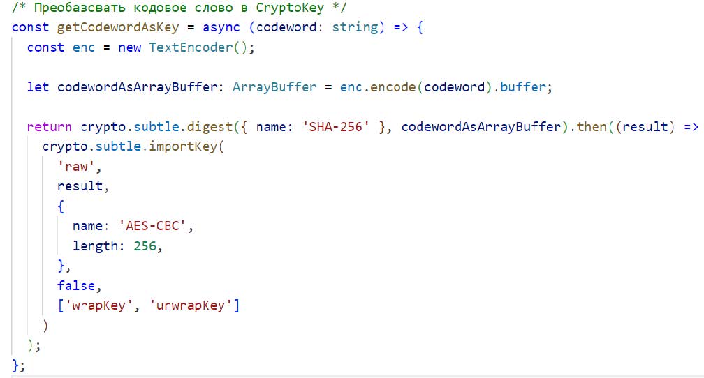 Создадим асинхронный метод getCodewordAsKey(), внутри которого будет происходить преобразование кодового слова из строки в CryptoKey. При помощи вызова enc.encode(codeword).buffer преобразуем кодовое слово – строку в ArrayBuffer – двоичное представление данных. Далее последовательно выполним методы интерфейса WebCryptoApi digest() и importKey(). В метод digest() передадим параметром алгоритм дайджеста (SHA-256) в формате объекта и ранее полученное кодовое слово в формате ArrayBuffer. Код метода getCodewordAsKey() представлен на рисунке 2.