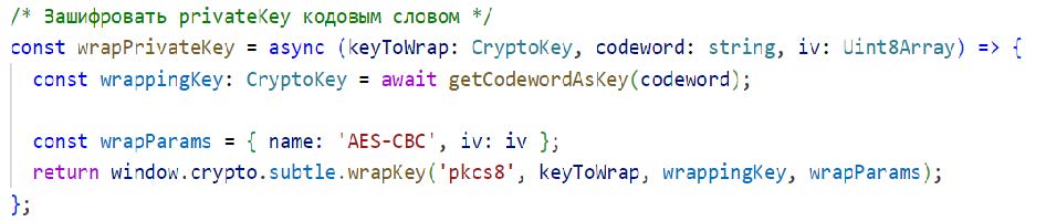 В этом методе вызовем ранее созданный метод getCodewordAsKey() для того, чтобы преобразовать кодовое слово из строки в CryptoKey, и после этого вызовем метод интерфейса WebCryptoApi wrapKey(). Параметр wrapAlgo – объект, указывающий алгоритм, который будет использоваться для шифрования ключа (AES-CBC), где iv – вектор инициализации, передаваемый аргументом в метод wrapPrivateKey(). Код метода wrapPrivateKey() продемонстрирован на рисунке 3.