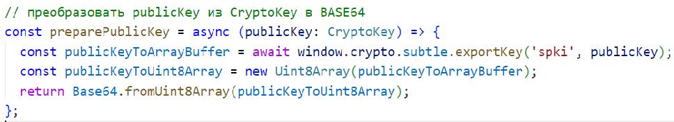 В методе preparePublicKey() вызовем метод интерфейса WebCryptoApi exportKey(), который принимает в качестве входных данных CryptoKey объект и возвращает ключ во внешнем переносимом формате. Результат выполнения предыдущей операции преобразуем в Uint8Array, а затем в BASE64. Код метода preparePublicKey() представлен на рисунке 4.
