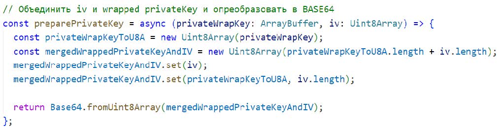 Вектор инициализации, полученный при оборачивании ключа кодовым словом, впоследствии будет нужен для обратной операции – расшифровки приватного ключа для осуществления подписи документа. Преобразуем зашифрованный кодовым словом приватный ключ в Uint8Array и выполним объединение массивов. Далее преобразуем полученное значение в BASE64.