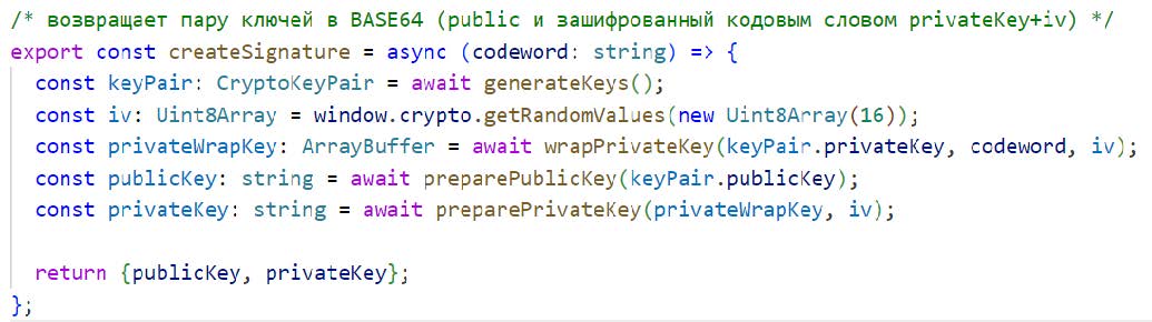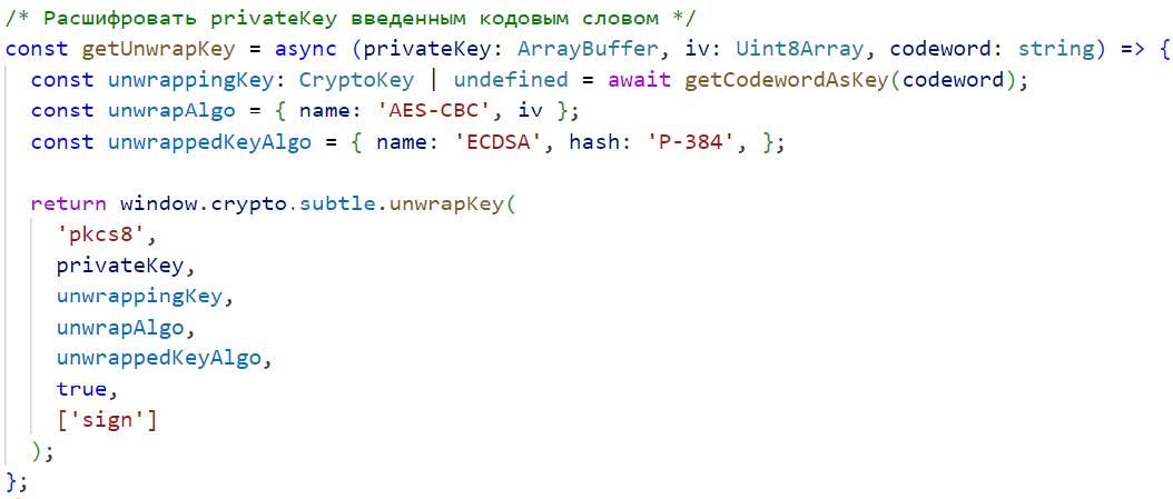 Далее создадим асинхронный метод wrapPrivateKey(), который в качестве параметров будет принимать приватный ключ электронной подписи, кодовое слово из заполненного пользователем поля формы и вектор инициализации – случайную последовательность байтов, который понадобится в дальнейшем также и для дешифровки ключа.