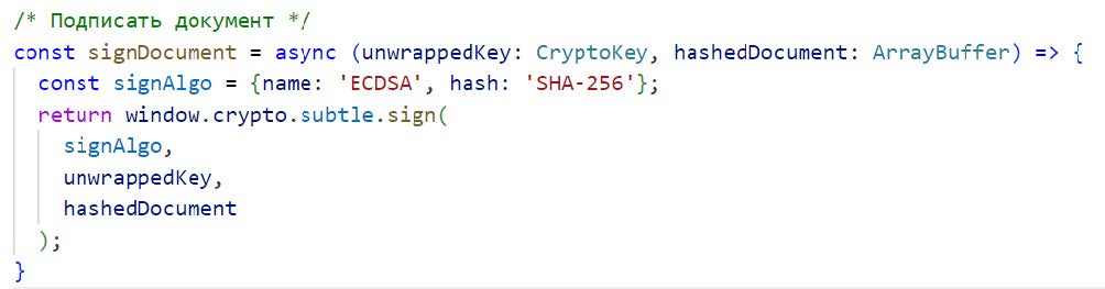 Для осуществления подписи документов создадим асинхронный метод signDocument(), принимающий параметрами файл, содержащий документ, и приватный ключ. В рамках данного метода вызовем метод интерфейса WebCryptoApi sign(). Результатом выполнения данного метода является подписанный документ в формате ArrayBuffer. Код данного метода представлен на рисунке 9.