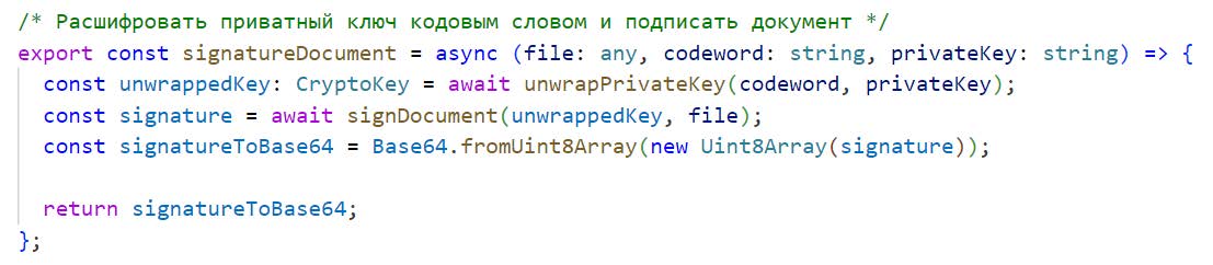 Далее создадим асинхронный метод signatureDocument(), принимающий параметрами файл документа, кодовое слово и приватный ключ (объединенный с вектором инициализации), полученные с сервера. Вызовем созданный ранее метод unwrapPrivateKey(), передав в него кодовое слово, объединенный приватный ключ и вектор инициализации. Далее вызовем метод signDocument(), передав в него полученный распакованный приватный ключ и файл документа. Полученную последовательность в формате ArrayBuffer подписанного файла преобразуем в BASE64 формат для отправки на сервер. Код данного метода продемонстрирован на рисунке 10.