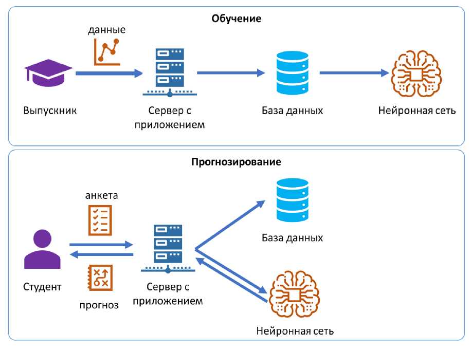 Для обеспечения функционирования сервиса прогнозирования трудоустройства студентов необходимо реализовать процедуру сбора данных и обучения системы прогнозирования. Для этого на первом этапе исследования необходимо организовать сбор информации о трудоустроенных выпускниках вузов. Полученные данные попадают на сервер, где происходит их дальнейшая обработка и хранение. Полученный массив данных выступает в качестве обучающей выборки для нейронной сети.