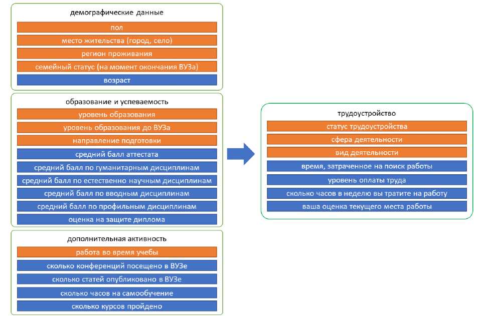 Учитывая, что данные собираются напрямую в виде анкетирования выпускников, количество вопросов было сведено к минимуму, в частности, успеваемость оценивалась не по каждому предмету, а по категориям. На рисунке оранжевым обозначены вопросы, предполагающие выбор одного варианта из списка предложенных, а синим – ответы в виде числового значения.