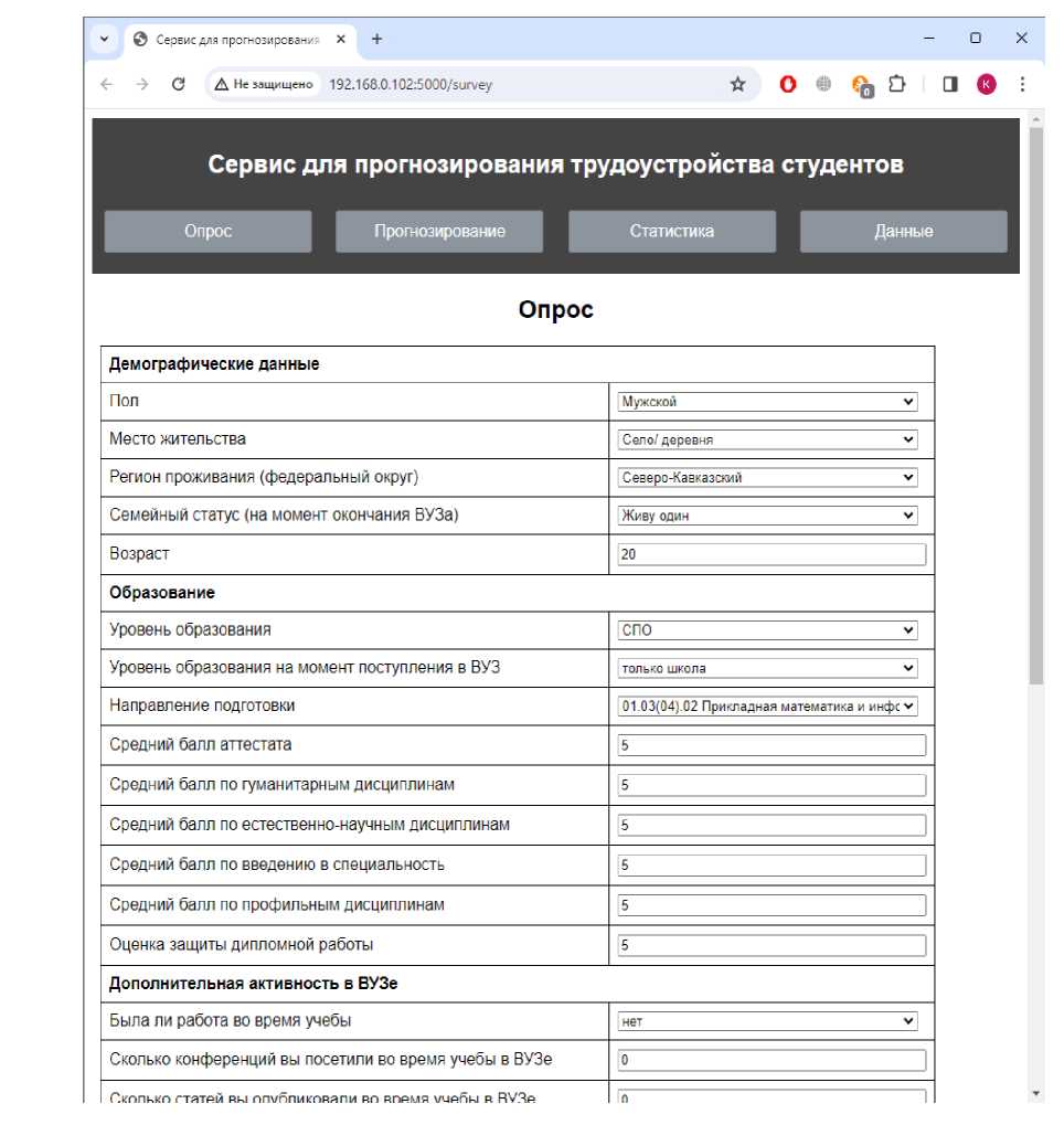 Сама страница сервиса собирается из двух шаблонов: общего шаблона с меню и шаблона конкретной страницы. Например, основная страница с опросом (рис. 1) состоит из блока с названием проекта, меню сайта, непосредственно опроса и нижней части сайта с данными об авторах. В меню реализован переход между всеми разделами сайта: опрос, прогнозирование, статистика и загрузка данных. Ниже находится форма с опросом, куда включены все вопросы из разделов по демографии, успеваемости, дополнительной активности и трудоустройству выпускников вузов (рис. 5). Стоит отметить, что на данном этапе акцент сделан на выпускниках Института искусственного интеллекта и цифровых технологий Кабардино-Балкарского государственного университета им. Х. М. Бербекова. В дальнейшем планируется расширить спектр вопросов и вариантов ответов для построения моделей для всех направлений подготовки высшего образования.