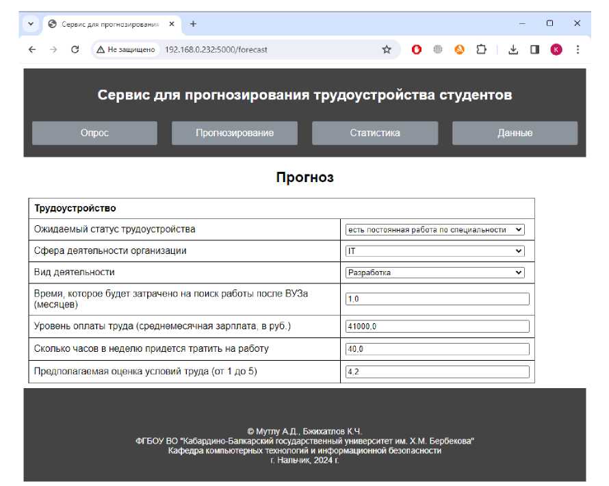 Fig. 6. Page with the results of employment forecasting based on student survey results