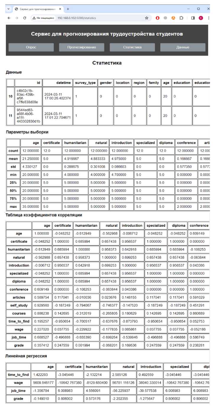 Сервис предоставляет возможность не только прогнозировать трудоустройство определенного студента, но и собирать и анализировать статистику, полученную в ходе анкетирования выпускников. Для работы с результатами анкетирования используется библиотека обработки больших данных pandas, которая обеспечивает загрузку, статистическую обработку, визуализацию и выгрузку данных [12, 13]. В частности, для оценки распределения ряда параметров в функции statistics() реализована загрузка содержимого базы данных в таблицу pandas, которая позволяет получить описание параметров. В описании выводятся следующие показания для числовых данных: количество, среднее значение, среднеквадратичное отклонение, минимальное и максимальное значения, а также медиана выборки. Все данные выводятся на веб-страницу со статистикой, показанную на рисунке 7.