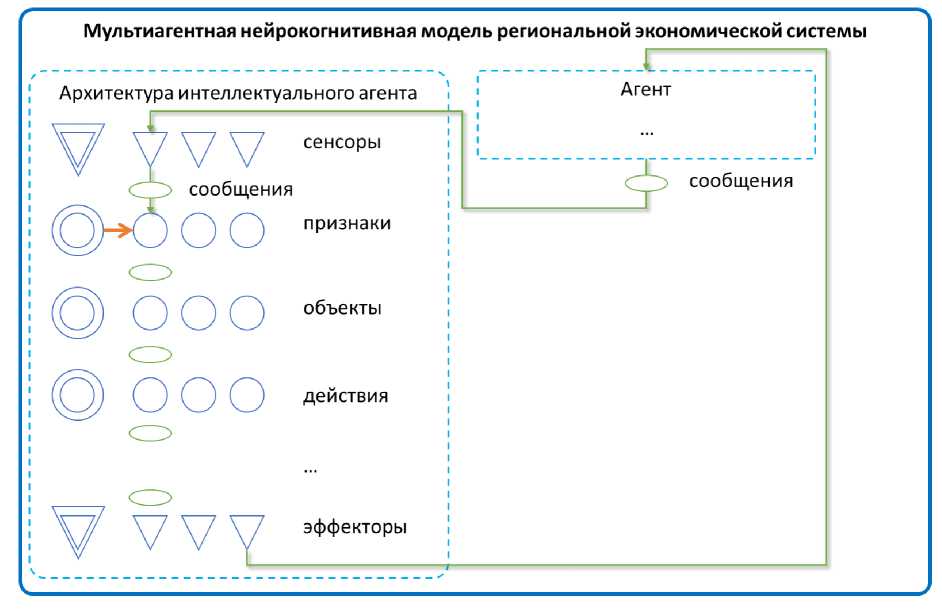 В ходе проведенного исследования была разработана концепция интеллектуальной системы моделирования экономических процессов, которая может стать частью системы управления инновационным развитием региона. Приведена структура мультиагентной модели региональной экономики, в которой рассматриваются отдельные экономические агенты, а также внешняя среда и региональная система управления. Поведение агента в подобной модели определяется набором доступных ресурсов, производственными возможностями, базой знаний, отвечающей за реакцию на внешние условия и целевой функцией агента. В качестве формализма системы моделирования агентов предполагается использование мультиагентных нейрокогнитивных архитектур. Предложенная архитектура обеспечит моделирование сложных процессов взаимодействия экономических агентов вплоть до движения ресурсов в зависимости от внешних условий и решений, принятых региональной системой управления.