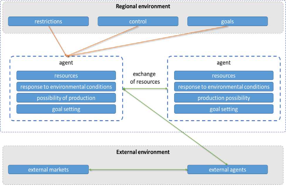 Как видно из рисунка, в качестве основного инструмента взаимодействия агенты используют возможность обмена ресурсами между собой и внешней средой, представленной внешними рынками и агентами. При этом на агентов влияют не только другие агенты, но и региональная среда, которая отвечает за ограничения действий агентов и некоторые управленческие воздействия. Кроме того, рассматривается возможность корректирования целей агентов (если агент является напрямую подчиненной структурой, например, государственным учреждением).