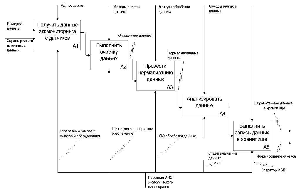 Одной из необходимых задач при документировании прикладной информационной системы является создание формализованного описания цепочки информационных процессов обработки и анализа данных в АИС экологического мониторинга на основе методов, процедур и подходов, основанных на методологии структурного системного анализа [6, 7].