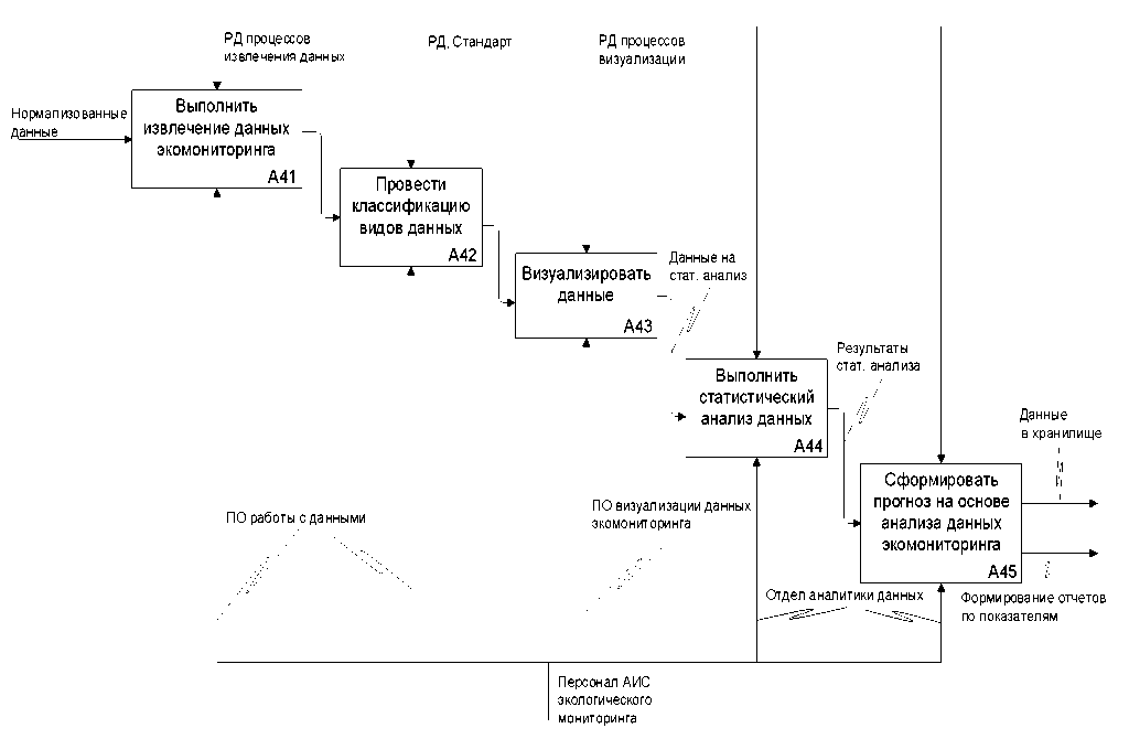 Рис. 3. Диаграмма уровня А41. Детализация информационных процессов интеллектуального анализа данных в АИС экомониторинга (ИБД – информационная база данных, РД – регламентирующая документация)