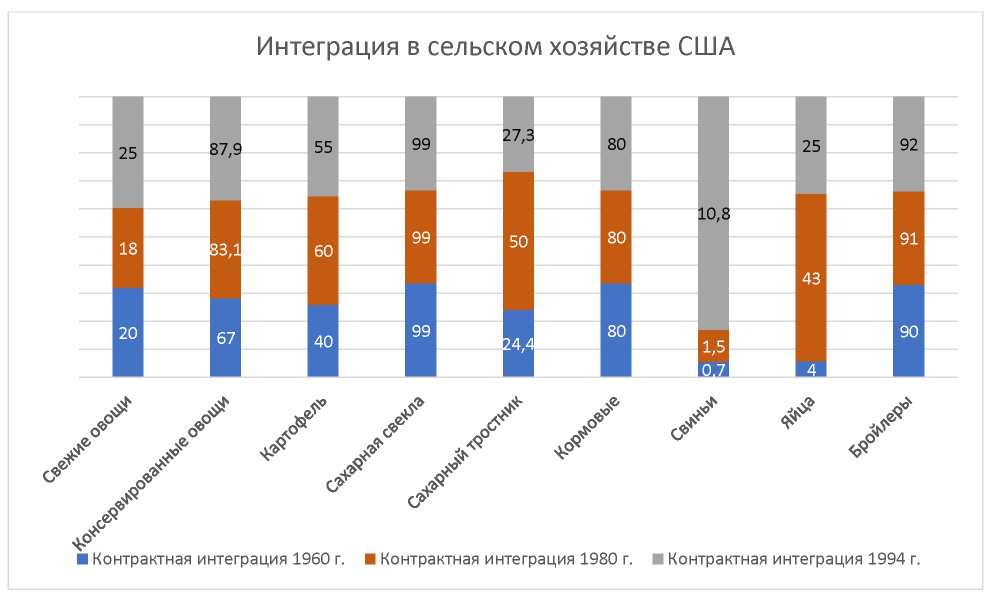 Рис. 1. Контрактная интеграция в сельском хозяйстве США, % от реализованной продукции