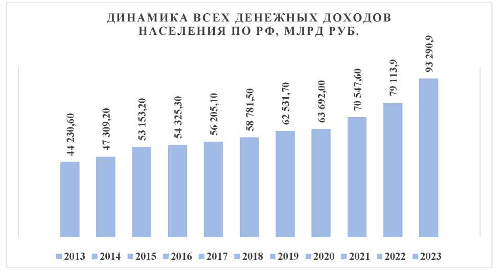 Из диаграммы видно, что общий объем денежных доходов населения в 2023 году вырос с 79 113,9 млрд руб. до 93 290,9 млрд руб. – на 14 177 млрд руб. В 2013 году средний доход на одного человека составлял 308,7 тыс. руб./чел., в пандемийном 2020-м – 434,2 тыс. руб./чел., а в 2023 г. – 637,2 тыс. рублей на человека. На диаграмме видно, что динамика денежных доходов российских граждан имеет тенденцию к росту, что может свидетельствовать о том, что благосостояние населения улучшается. Однако важно помнить, что рост доходов не всегда приводит к повышению уровня жизни. Важно, чтобы доходы соответствовали реальным потребностям людей и способствовали их благополучию.