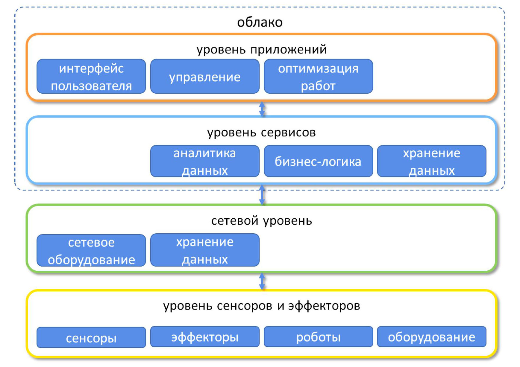 В современное производство уже достаточно долго успешно внедряются технологии, связанные с «Индустрией 4.0». Например, технологии интернета вещей (IoT) находят применение в автоматизации сбора и обработки информации с производственных участков [3]. К примеру, использование беспроводных сенсорных сетей позволяет существенно снизить затраты на прокладку кабелей в здании, что позволяет заметно сэкономить несмотря на дороговизну самих датчиков. При этом многие из используемых датчиков зачастую имеют бортовые системы предварительной обработки данных, что позволяет разгрузить сеть передачи данных и своевременно среагировать на ряд внештатных ситуаций на месте их регистрирования. Кроме того, авторы предложили сервис-ориентированную архитектуру для систем IoT на производстве (рис. 2). На более высоких уровнях архитектуры полученные данные обрабатываются за счет технологий больших данных и искусственных нейронных сетей.