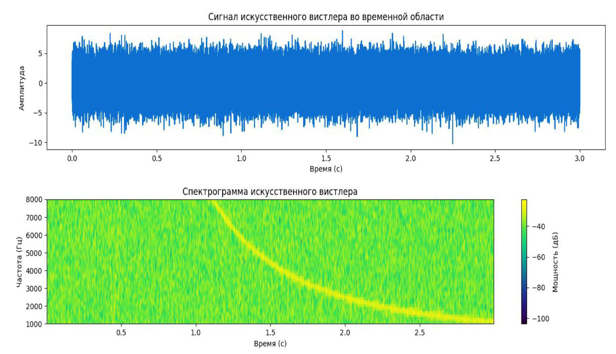 Основные этапы заключаются в подключении соответствующих математических библиотек numpy, scipy, а также библиотеки для визуализации matplotlib. Далее определяются временная ось и функция для генерации искусственного вистлера на основе соотношения (2). Чтобы данные были приближены к реальным, добавляется в генерацию вистлера случайный шум, который имеет нормальное распределение с нулевым средним и стандартным отклонением 0.1. Далее проводится визуализация искусственного сигнала во временной области, а также строится спектрограмма частот с помощью команды signal.spectrogram из библиотеки scipy.