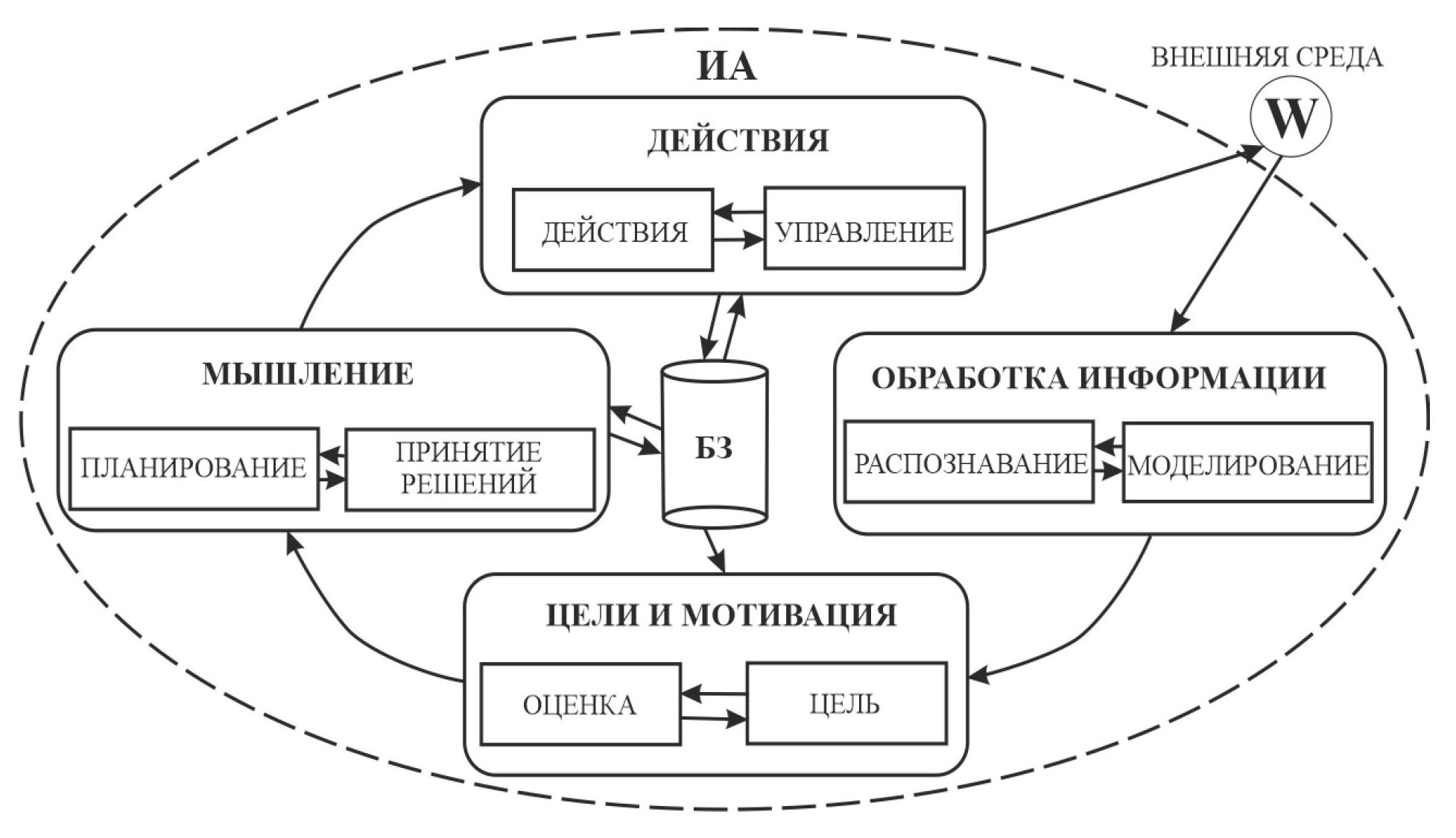 Интеллектуальный агент (ИА) на основе мультиагентной нейрокогнитивной архитектуры представляет собой биоинспирированную систему искусственной жизни и рационализирован как автономная сущность, наблюдающая за окружающей средой через датчики (сенсоры) и взаимодействующая с ней с помощью эффекторов. Анализ входных потоков данных и процесс интеллектуального рассуждения при принятии решений агентом строятся на основе работы управляющей нейрокогнитивной архитектуры, которая состоит из связанных между собой когнитивных блоков (на рисунке представлены в прямоугольниках) и базы знаний агента (рис. 1). В когнитивных блоках образуются функциональные узлы, которые состоят из программных агентов-нейронов (агнейронов) разной степени сложности и типов, которые выполняют последовательность обязательных операций: распознавания входных образов, эмоциональной оценки, целеполагания, синтеза плана действий, проактивного моделирования, управления выполнением плана. Каждая из этих операций выполняется на основе мультиагентного алгоритма, основанного на обмене сообщениями между агнейронами различных типов. Так, обработка и интерпретация собранных данных происходят в функциональном узле распознавания агнейронами – объекты, действия, события. Результатом работы этого узла является внутренняя модель окружающей среды, информация о которой содержится в базе знаний агнейрона моделирования. Агнейронами оценки проводится оценка текущего состояния, в соответствии с которой генерируются результаты, которые агент пытается достичь, и механизмы, определяющие приоритетность целей и реакцию на изменения в окружающей среде. Далее в функциональном узле планирования происходит определение последовательности действий для достижения целей. В узле принятия решений происходит выбор наилучшего действия на основе текущих данных и целей. В узле действия происходят оценка эффективности выбранных действий и достижение целей. Далее агнейронами управления выбранные действия передаются на эффекторы ИА для выполнения действий в окружающей среде. Это могут быть физические действия (например, движение робота) или виртуальные (например, отправка сообщений). Полученные результаты передаются на агнейроны моделирования для корректировки внутренней модели и принятия будущих решений. Анализ входных потоков данных, синтез плана поведения, отправка сообщений другим агнейронам выполняются системой управления, основанной на применении знаний, содержащихся в базе знаний агнейрона. Знания представляют собой продукционные правила, в условных частях которых содержатся наборы логических условий, в соответствии с которыми анализируются входные сообщения, а консеквентные части – наборы инструкций по отправке выходных сообщений другим агнейронам.
