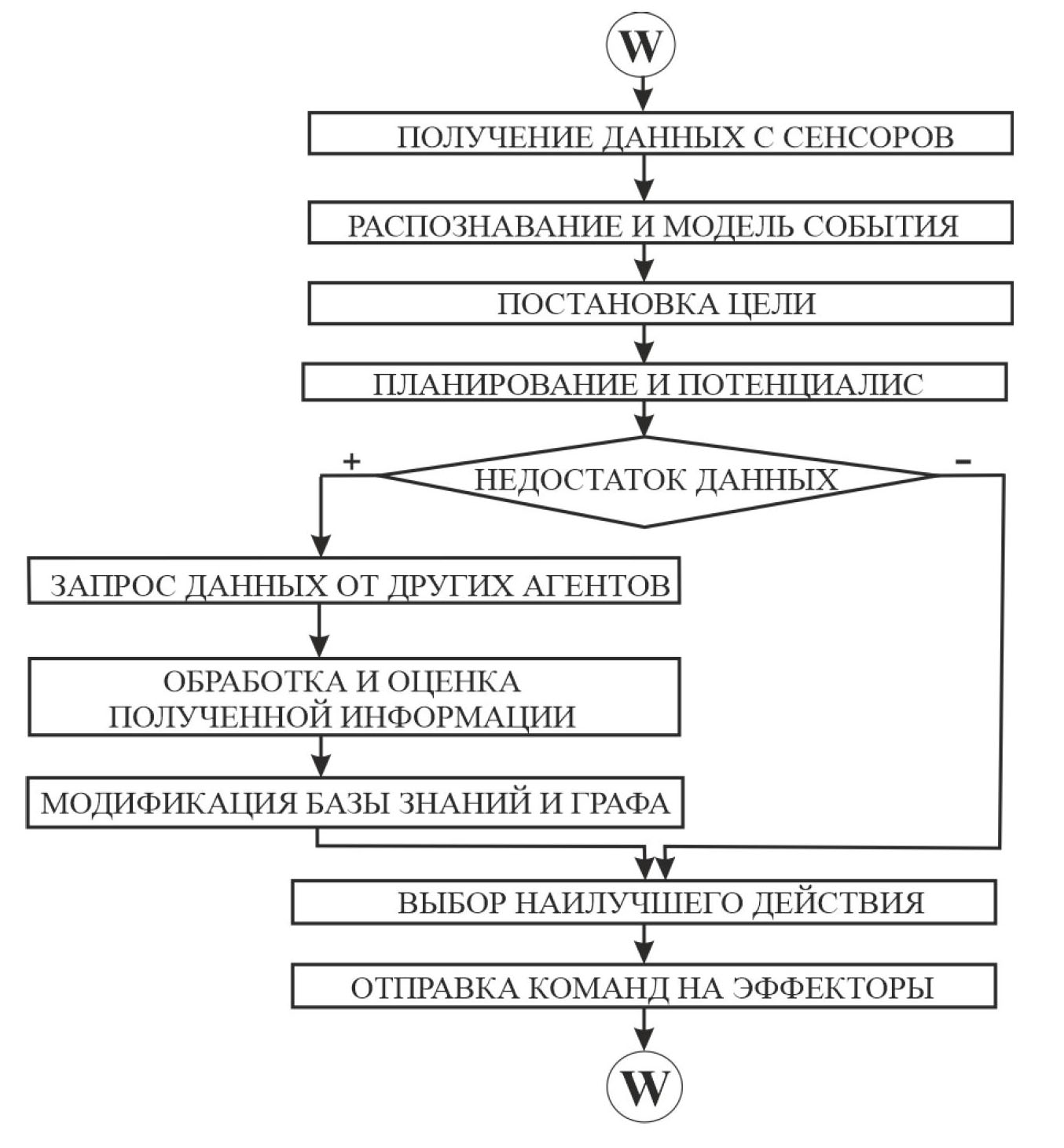 Каждый агент в рамках выполнения своей задачи получает данные с сенсоров. Полученные данные проходят процедуру предварительной обработки и распознавания. В результате система управления агента формирует описание распознанного события и возможные пути в дереве решений. Если для решения поставленной задачи недостаточно данных, агент запрашивает необходимые данные у других агентов системы. В результате итеративной процедуры обмена запросами и ответами между интеллектуальными агентами достраивается или модифицируется граф проблемной ситуации каждого агента, входящего в состав коллектива. Это позволяет получить в составе коллектива мультиагентную самоорганизацию, которая описывает динамические процессы отражения состояний системы «автономный агент – среда» и синтеза поведения автономного агента, направленного на движение по графу проблемной ситуации, определенному в пространстве состояний, размеченному значениями целевой функции. Основной метод, который используется для синтеза коллективного поведения, состоит в создании условий для роста и развития управляющей мультиагентной нейрокогнитивной архитектуры интеллектуального агента на основе данных, получаемых им в процессе взаимодействия с пользователем, автономными или роботизированными агентами, и принципа суперпозиции сформированных графов проблемных ситуаций всех участников коллектива в общий граф. Вершинами этого графа будут сложные состояния, представляющие собой объединения состояний всех агентов в составе коллектива, а дугами – совокупности действий участников коллектива, ведущие из одних сложных состояний в другие.