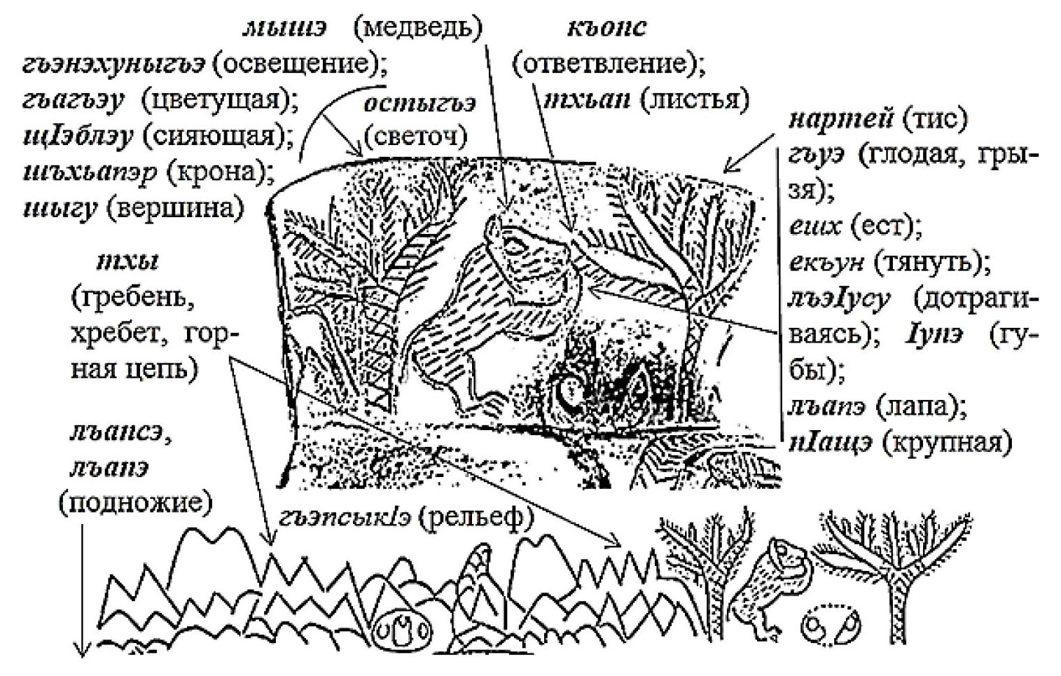 Отдельным контекстом в свете сакральной (культовой) характеристики надпись гласит: «Нартей (Натий) ТхъащIагъ абарагъуэ Мыекъопс ТхалъэIупIэ лъапIащэу, щIэблэу/шIэту шъхьа шыгу» – «Нартеи, под богом Тха огромная Майкопса, священного места проведения сходов, жертвоприношений и молений богу Тха, сияющая головная вершина». Этот текст выводится соединением выделенных лексических единиц (рис. 1) из очевидного описания изображений: «Нартей тхьапэ щIагъу, абара гъуэ мыщэ ещхъ (екъу, елъеф) къуэпс тхьапэр, лъэIусу упам лъэпащэу (лъапIащэу). ЩIэблэу/шIэту шъхьапэ шыгу» – «Под листвой тиса (Нартеи), прикладывая лапу и глодая, мыщэ (медведь) ест (дергая, тянет) лист (от)ветвления (или отросток листа), прикасаясь/дотрагиваясь губы протянутой лапой (крупной лапой)». Описание во втором предложении (в прямом и переносном смысле) гласит: «Светящаяся вершина кроны» и т.п.