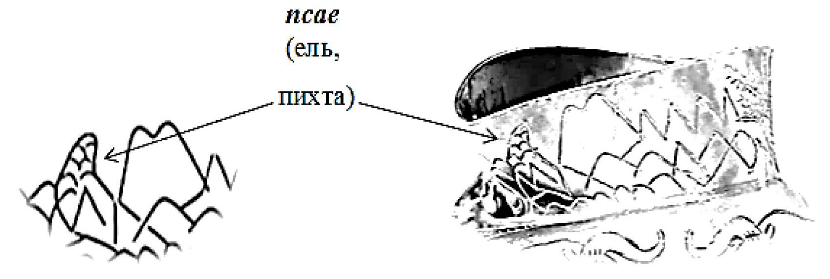 На рис. 3 приводятся базовые, исходные хатто-адыг. названия пиктограмм и их фрагментов: щиху (тополь), уэр/ор (волна; бурный), ха (арх. орел), тыха (арх. лев), дзэ (зуб), шы (лошадь), псы уэр/псыор (поток; речная волна), гу зэгупэ (бык перед быком). Из них в той же последовательности озвучивается предложение: «ЩIыхь Уэр-Хаты ха дзэ щыпсэуа(р) гузэгу пэ» – «Передовой центр, где проживал почтенный, глава войска Уар-Хатти». Слово щIыхь (или щихъ) – «святой», «почтенный» и др. выводится из созвучного щиху (тополь). Влаголюбивый тополь олицетворяет побег с тополиными признаками (почки, узлы, семена с пухом и др.), исходящий из правого русла реки, потока, изображенного на сосуде [1, с. 64]. Слово уэр/ор (волна; бурный; могучий) может вычленяться вторым слогом из очевидной пиктограммы правого русла реки – пс(ы) уэр (поток), т.к. префиксальный слог этого понятия озвучивает слово псае – «пихта/ель» (куда восходит исток реки), которая изображена вне пределов средней части сосуда – на его горловине (рис. 4); адыг. уарш означает «плеск» [8, с. 334].