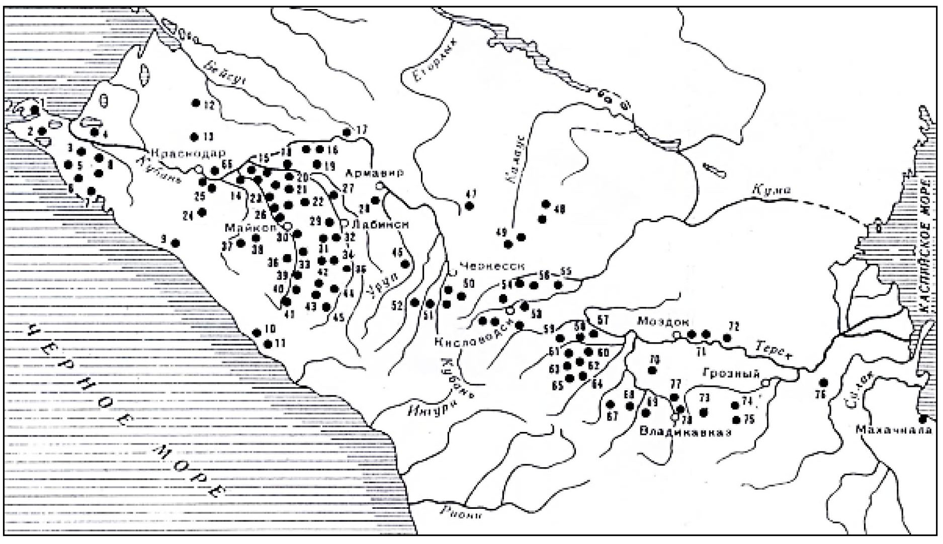 Рис. 7. Памятники майкопской культуры (по Р. М. Мунчаеву)