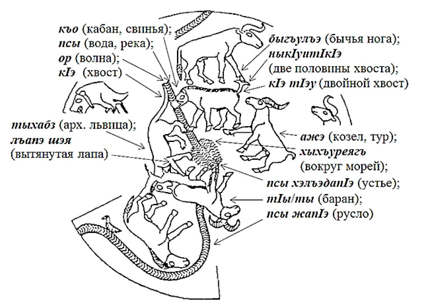 Надпись на днище сосуда (рис. 9) считывается по ходу «шествия», которое начинается с пиктограммы козла и заканчивается на изображении русла второй реки. Визуальное описание здесь преломляется в контексте, который в части сакрального нарратива гласит: А жэ(р) быгъулъэныкъуиткIэ, тIуащIэ къопс оркIэ, Псытха бза/бзыкIэ, лъапIэщэ ты псалъэуэ, хытI хъуреягъу, псыжапIэ-хэлъэдапIу – «(А) этими текущими по обе стороны быков /по двум боковым сторонам двойным волновым ответвлением/рукавом рек Псытха, нашего святейшего слова, гравирована вокруг двух морей, руслами-устьями рек». Понятие А жэ(р) – «(А) этими текущими/бегущими» озвучивается полным омонимом из слова ажэ (р), где ажэ – «козел; тур» (частица р – показатель причастия и определенного существительного). Понятие быгъулъэныкъуиткIэ – «по обе стороны быков» формируется соединением названий образов: быгъу – «бык», лъэ – «нога» быка, которая упирается в ныкъуиткIэ – «две половины хвоста» (кабана) и может озвучиваться как б(ы)гъулъэныкъуиткIэ – «по двум боковым сторонам». Однако смысл не изменится, если исключить это составное слово, трактуемое с привлечением сочлененной пиктограммы быка из среднего яруса, поскольку оно может заменяться очевидным понятием кIэ тIуащIэ – «двойной хвост» или кIэ тIэу – «двумя хвостами/концами» (кабана). Словосочетание тIуащIэ къопс(ы) оркIэ – «двойным волновым ответвлением, рукавом (рек)» образуется из понятий: тIуащIэ – «двойной, раздвоенный» (хвост кабана); сочленения слога къо, озвученного словом «кабан» и псыор – «речная волна; поток» (уголки в виде волн, указывают направление потока), куда приходится голова кабана, образуя понятия къопс(ы)ор – «волновое ответвление, рукав реки, проток», где ор/уэр – «волна», «бурный» и кIэ – «хвост» львицы, в который упирается пасть кабана, образуя грамматическую форму оркIэ – «волновыми». Альтернативные прочтения – тIуащIэ къо псыоркIэ – «двумя волновыми речными долинами» и кIэ тIэу къуэжкIэ – «двойными концами рукавов рек», где формант ж производен от ижь/жэ – «течение». Выражение Псытха бза/бз(ы)кIэ – «Псытха гравирована», где Псытха – теоним в значении Богиня вод/рек, – образуется сочетанием слов: псы – «вода/река», куда ступает львица – арх. т(ы)хабз, где т(ы)ха – «божество», бз(ы) – «самка» (омоним – «вырезанная»), а в сочленении с кIэ (хвост) – бз(ы)кIэ (гравированная) [7, с. 189]; хвост барана изображен куцым, словно вырезан – бза [8, с. 28]), отхвачен – (бз(ы)кIэ) раскрытой пастью львицы, подобно ножницам. Сочетание лъэпащэ – «распрямленная передняя лапа» (львицы) или лъапIэщэ – «крупная нога» озвучивают понятие лъапIэщэ – «очень дорогим, почитаемым, святым». Сочетание ты/тIы «баран» (хатт.: ti [5, с. 54]), псы (река), лъэ (нога) уа/иуа (впала, провалилась) озвучивает понятие ты псалъэуа – «нашим словом» (очень почитаемым). Поскольку на дне сосуда изображен абстрактный водоем, куда впадают и Кубань, и Терек и вокруг которого разворачивается «процессия», то в равной мере он может расцениваться и как Черное море, и как Каспийское. Соответственно, образуется понятие хытI хъуреягъу – «вокруг двух морей», где безударная, грамматическая форма тI(ы) выводится из омонима тIы (баран), означая в конце слов число два (тI). Очевидно, что животные, и в т.ч. львица, расположены вокруг водоема. Слово псыжапIэ означает «русло», букв. «место, где течет река» – пиктог