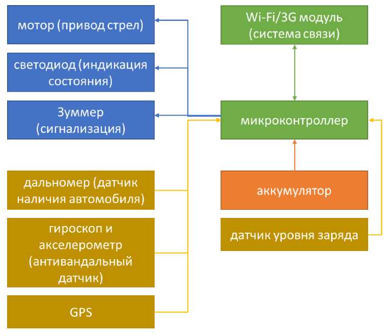 На роботизированном устройстве расположен привод с актуатором, который позволяет разворачивать и сворачивать робота-парковщика и боковые стрелы. Для управления роботом-парковщиком используется микроконтроллер, который обеспечивает сбор данных с установленных сенсоров (датчик наличия автомобиля над роботизированным устройством, датчик, отслеживающий попытку взлома или перемещения робота-парковщика) и управление эффекторами роботизированного устройства (привод стрел, светодиодная индикация состояния и звуковая сигнализация), в том числе в автоматическом режиме независимо от связи с сервером по неотложным событиям (поднятие барьера при отъезде автомобиля, сигнализация при актах вандализма или попытках переместить робота-парковщика). В различных конфигурациях роботизированного устройства используются WiFi или 3G-модемы для обеспечения связи с сервером. Кроме того, для удобства автомобилистов реализована функция автоматического поднятия и блокировки парковочного места после отъезда автомобиля. Для защиты от актов вандализма и кражи на роботизированном устройстве реализовано автоматическое срабатывание сигнализации. Для обеспечения питания роботизированного устройства используется легко заменяемый аккумулятор. Схема реализации робота-парковщика приведена на рис. 3.