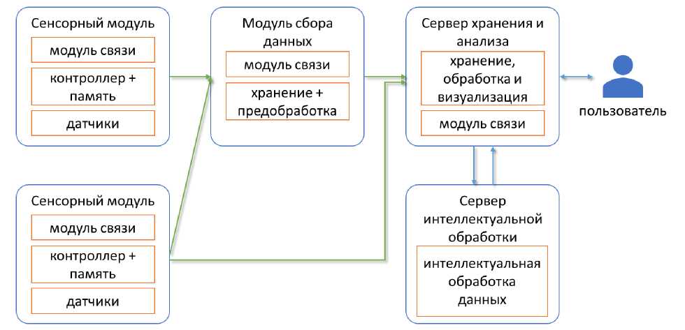 Основным источником данных в подобной системе является сенсорный модуль, состоящий из микроконтроллера, модуля связи и расширяемого набора датчиков, причем состав и количество датчиков на модуле не ограничены, что позволяет достаточно просто масштабировать сенсорную систему. Все сенсорные модули занимаются сбором данных, их временным хранением (при отсутствии связи) и отправкой на ближайший доступный модуль сбора данных. Эти модули в свою очередь также могут собирать данные, проводить базовую предобработку и пересылать их к основному серверу. Сервер хранения и анализа данных представляет собой классических веб-сервер, где все полученные данные обрабатываются и хранятся в базе данных. При этом для обеспечения интеллектуальной обработки данных на сервере реализована возможность отправки полученных данных на отдельные системы интеллектуальной обработки (как в рамках локальной сети, так и по сети интернет) за счет набора соответствующих программных протоколов. То есть после сбора определенного набора данных с сенсорной сети сервер принимает решение о необходимости их обработки (например, прогнозирования следующих значений) и отправляет запрос на отдельный сервис, а полученный ответ также записывает в свою базу данных. Кроме того, сервер отвечает за визуализацию данных и взаимодействие с пользователями и администраторами системы.
