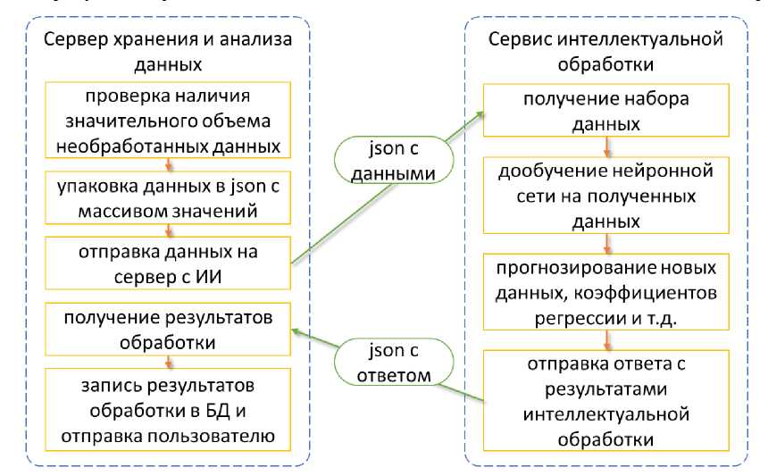 Использование набора программных протоколов (API) позволяет использовать различные подходы в интеллектуальной обработке многомодальных данных, включая как классические нейронные сети, сверточные нейронные сети, большие языковые модели, так и более специфические формализмы обработки данных. Например, для прогнозирования новых показаний датчиков предполагается использование сервиса, в рамках которого реализована полносвязанная нейронная сеть с возможностью дообучения и прогнозирования по запросу в виде json-сообщения. Схема подобного взаимодействия показана на рис. 2.