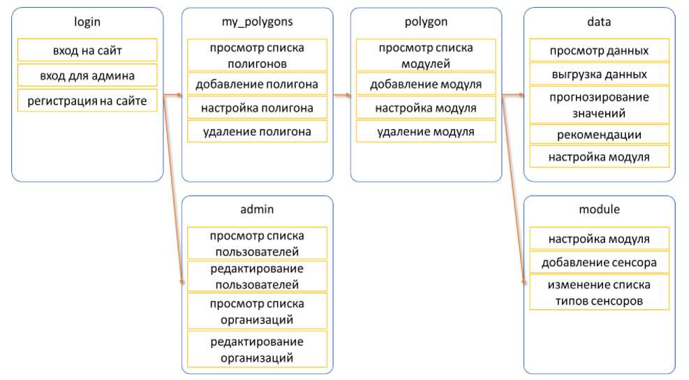 При входе пользователь попадает на страницу авторизации (login), где можно войти в свою учетную запись или создать новую. Стоит отметить также наличие перехода на страницу администратора (admin), который имеет возможность управлять списком пользователей и организаций, зарегистрированных на сервере. После входа пользователи перенаправляются на страницу со списком доступных полигонов (my_polygons), где пользователь может создавать, редактировать и удалять полигоны или перейти на страницу конкретного полигона (polygon). Здесь пользователь уже работает со списком сенсорных модулей, установленных на полигоне. В частности, можно добавить или удалить модуль, а также перейти на страницу управления модулем (module) или на страницу просмотра данных с датчиков полигона (data). На странице просмотра данных сервер выводит графики всех сенсоров, используемых в полигоне, карту распределения показаний, а также результаты взаимодействия с интеллектуальными системами обработки данных – прогнозируемые значения показаний и рекомендации по реагированию на условия на полигоне. Редактирование модуля позволяет изменять список сенсоров, менять протоколы обмена данными и корректировать параметры используемых датчиков.