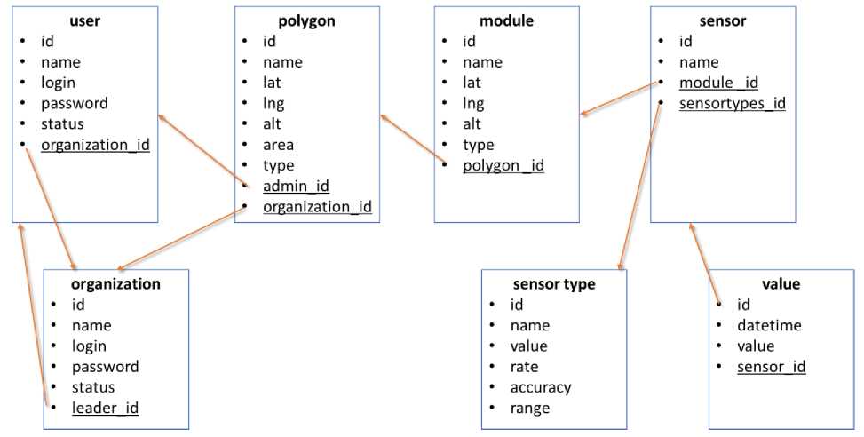 В базе данных используются таблицы с данными пользователей (user), организаций (organization), полигонов (polygon), модулей (module), сенсоров (sensor), типов сенсоров (sensor type) и таблица с данными датчиков (value). В таблице полигона и модуля указываются координаты и высота над уровнем моря, а уже в таблице с данными – время, когда был произведен замер. Измеряемая величина, единица измерения, точность и допустимый диапазон хранятся в таблице sensor type.