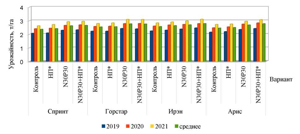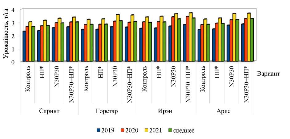 Анализ результатов исследования показал, что на фоне глубокого рыхления также наиболее оптимальным вариантом питания растений подсолнечника является N30P30+НП. На данном варианте опыта максимальная урожайность по всем гибридам зафиксирована также в 2021 году – наиболее оптимальном по условиям наличия продуктивной почвенной влаги. В целом по опыту получена высокая урожайность по всем исследуемым гибридам: Спринт – 2,96 т/га, Горстар – 3,09 т/га, Ирэн – 3,11 т/га и Арис – 3,08 т/га. При этом за годы исследования НСР05 для частных средних – 0,12 т/га. В среднем за 2019–2021 гг. урожайность исследуемых гибридов по обработке почвы была 2,62 т/га (НСР05 – 0,03 т/га). В среднем по гибридам она составила: Спринт – 2,68 т/га, Горстар – 2,81 т/га, Ирэн – 2,91 т/га и Арис – 2,96 т/га (НСР05 – 0,04 т/га). По доле влияния удобрений в среднем урожайность гибридов оказалась на уровне 2,66; 2,71; 2,91 и 2,83 т/га (НСР05 – 0,04 т/га).