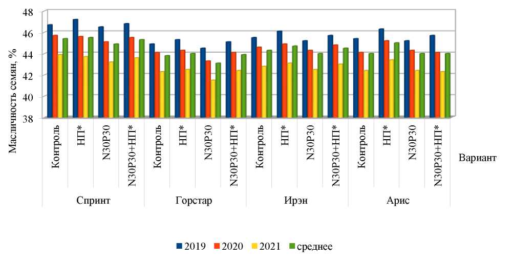 Анализ результатов исследования показал, что на фоне глубокого рыхления максимальная масличность семян по всем гибридам зафиксирована также в 2019 году – наиболее засушливом по условиям увлажнения почвы. В целом получена высокая масличность по всем исследуемым гибридам, хотя и ниже, чем по отвальной вспашке: Спринт – 47,2 %, Горстар – 45,3 %, Ирэн – 46,1 % и Арис – 46,3 %. В среднем за 2019–2021 гг. масличность семян исследуемых гибридов по обработке почвы была 44,4 % (НСР05 – 0,1 %). В среднем по гибридам она составила: по Спринту – 45,3 %, Горстар – 43,7 %, Ирэн – 44,4 % и Арису – 44,2 % (НСР05 – 0,1 %). По доле влияния удобрений в среднем масличность семян исследуемых гибридов выявлена на уровне 46,2; 46,8; 45,9 и 46,4 % (НСР05 – 0,1 %).