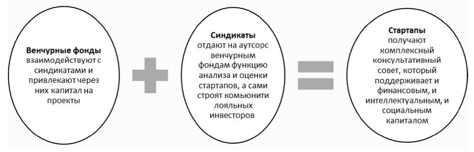 Начиная с 2010 г. в США начали создаваться сообщества бизнес-ангелов, которые путем совместных «усилий» – объединения инвестиций, стали формировать небольшие фонды в целях финансирования стартапов на ранних раундах. В самом начале такие сообщества имели не более 100 участников, но постепенно они трансформировались в онлайн-платформы с целью объединения капитала и создания фондов финансирования технологических новшеств, что стимулировало появление определенной конкуренции между инвесторами венчурного рынка и предоставило дополнительные возможности привлечения средств для фаундеров стартапов. Это также открыло возможности для объединения капитала крупных венчурных фондов и частных инвесторов в процессе софинансирования инновационных проектов по схеме 50/50. Сообщества бизнес-ангелов стали таким образом генераторами доходов для многих крупных венчурных фондов на современном этапе их развития, более того последние выступают уже инициаторами создания клубов, предлагая бизнес-ангелам синдикатные проекты с фаундерами технологических новаций, проекты которых инвестируются и самим венчурным фондом.