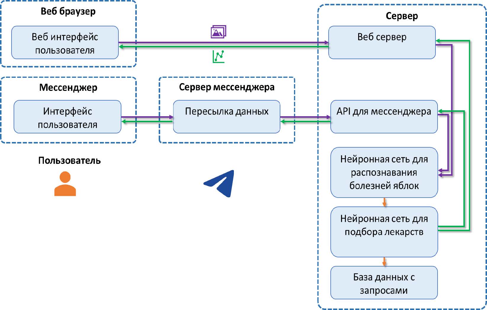 С целью обеспечения возможности быстрого определения болезни яблони и подбора рекомендаций по защите разрабатывается сервис контроля состояния яблоневых садов. Для удобства пользователя сервис реализован в виде веб-сайта, а также в виде бота для мессенджера «Telegram». Соответственно, пользователь может подключиться к сервису либо через веб-браузер, либо из приложения мессенджера. В обоих случаях на сервер передается фотография яблока, которая передается в нейронную сеть, обученную распознавать болезни яблок. Далее результат ее работы передается в нейронную сеть, подбирающую рекомендации. Стоит отметить, что на сервере также есть база данных, хранящая все предыдущие запросы и рекомендации к ним, сгруппированные по садам пользователя. Архитектура разработанного сервиса приведена на рисунке 1 (сиреневые линии – передача изображения, оранжевые – передача промежуточных данных, зеленые – ответ пользователю с рекомендациями).