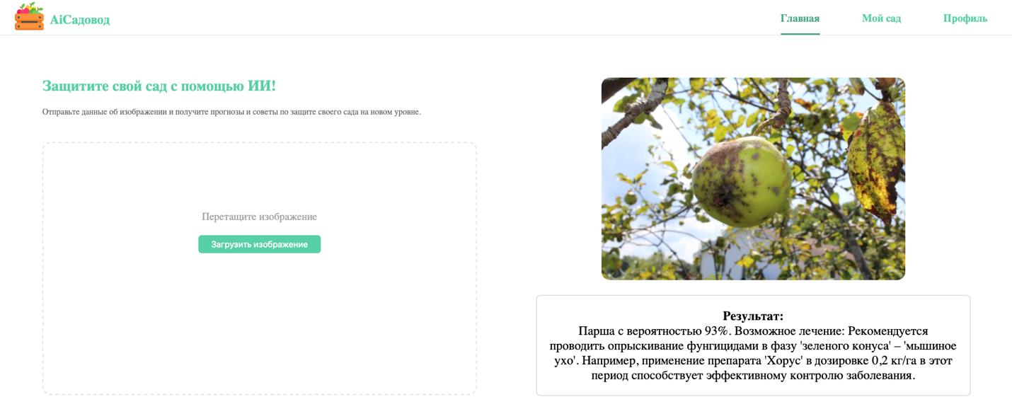 Представленный сервис позволит диагностировать заболевания яблонь с минимальными задержками по времени, а также обеспечить подбор методов защиты в случае необходимости. Это должно позволить снизить риски потери урожая садоводами Кабардино-Балкарской Республики. Тестирование программы показало применимость сервиса, в частности обеспечение распознавания базовых заболеваний, характерных для яблони, и выдачу рекомендаций по их защите (в том числе и в формате pdf-файла). Реализация сервиса в виде веб-приложения снимает необходимость портирования системы на различные платформы и максимально упрощает взаимодействие с системой. Применение чат-бота еще больше упрощает интерфейс пользователя.