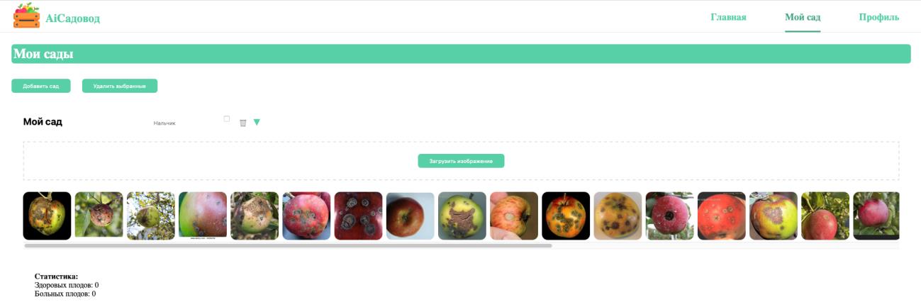Разработанный веб-сервис представляет собой программу, написанную на языке программирования python с использованием FastAPI1, который представляет собой высокоуровневый веб-фреймворк, что упрощает создание безопасных и масштабируемых веб-приложений. Клиентская часть сервиса использует Vue.js2 – JavaScript-фреймворк для создания пользовательских интерфейсов. Отчет об обработке изображения формируется в формате PDF с использованием библиотеки PyPDF3. Внешний вид главной страницы приведен на рисунке 2. На нем доступны ссылки на личный кабинет пользователя и список садов, в основной части располагается приглашение к загрузке изображения. После загрузки изображения сервис сразу выводит результаты – описание болезни (при ее наличии) и рекомендации по защите. Эти данные можно выгрузить в виде pdf-файла. Для зарегистрированных пользователей доступно объединение набора изображений в сад, где ведется учет всех рекомендаций, полученных пользователем (рис. 3). Структура разработанного сайта и базы данных подробнее описаны в [19].