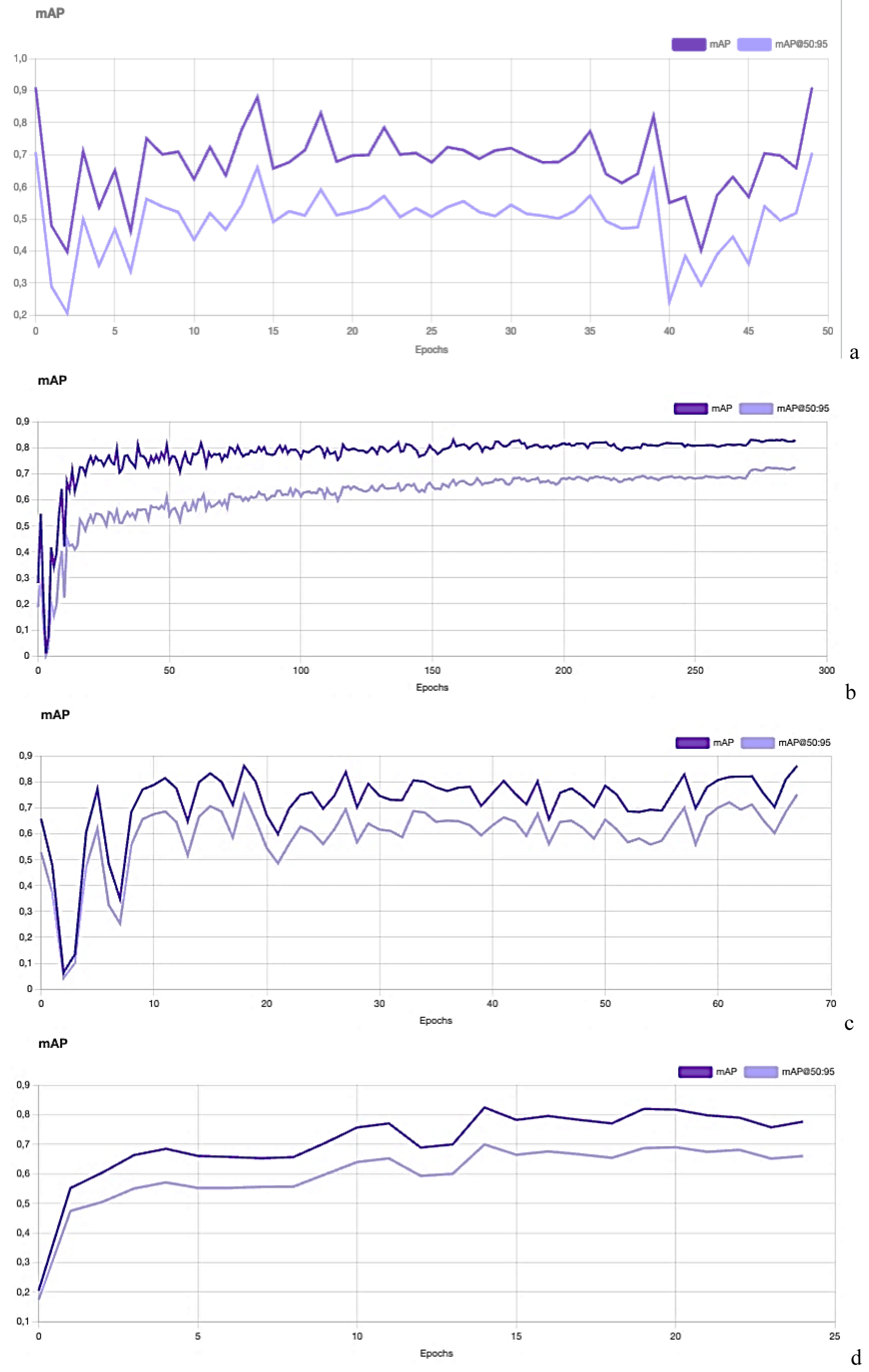 Fig. 6. Dependence of the mAP metric on the neural network training epoch for models based on Roboflow 3.0 (a), Yolo v12 (b), Yolo v11 (c) and RF-DETR (d)