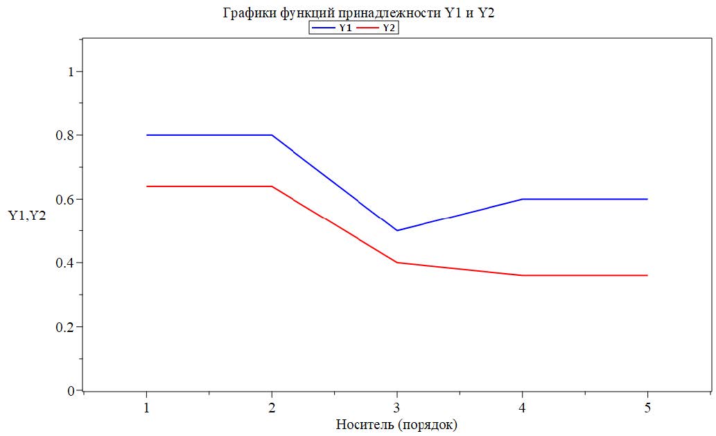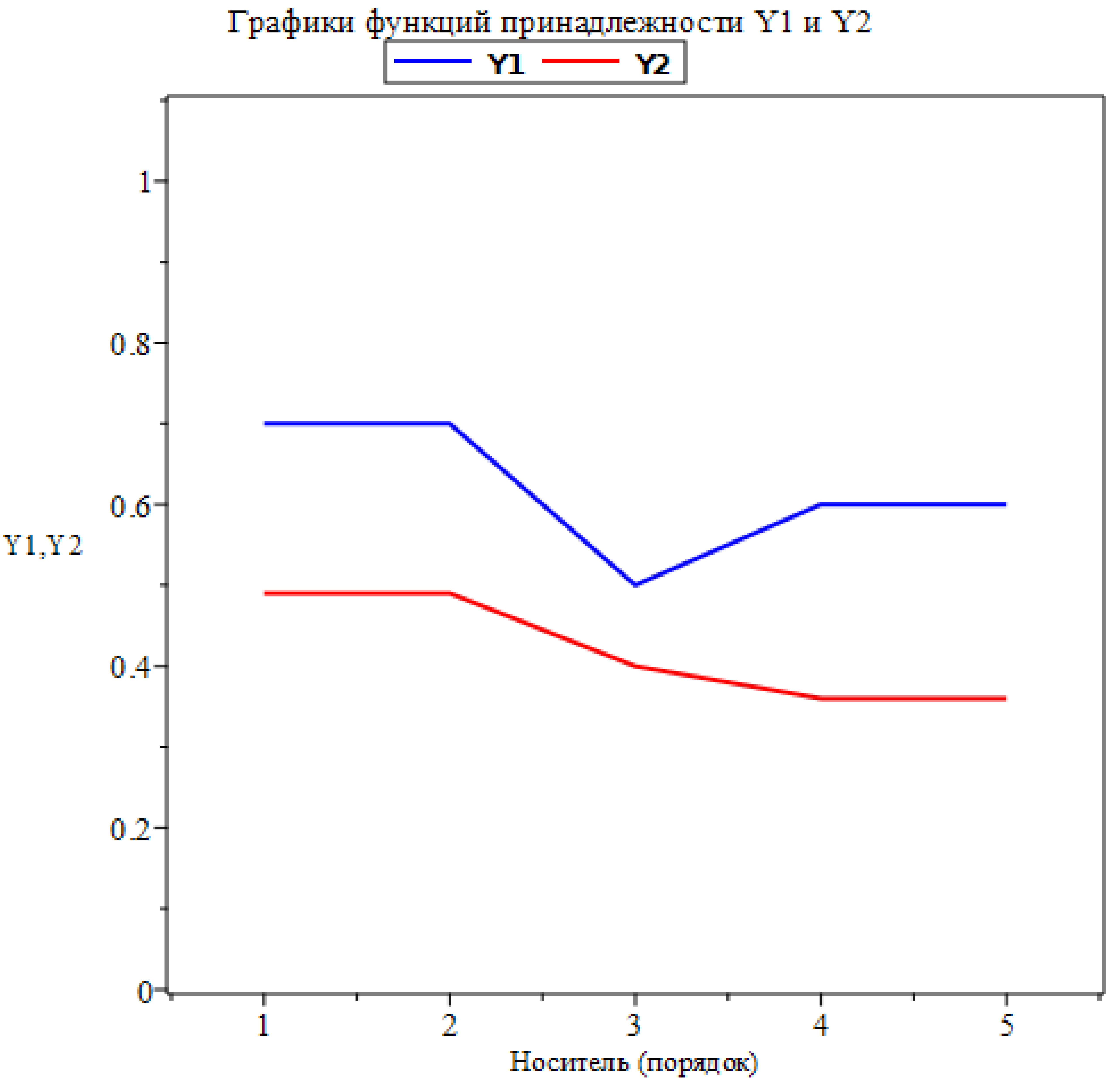 Остальные нечеткие множества возьмем из предыдущего примера. На рис. 2 приведены графики функций принадлежности Y1 и Y2.