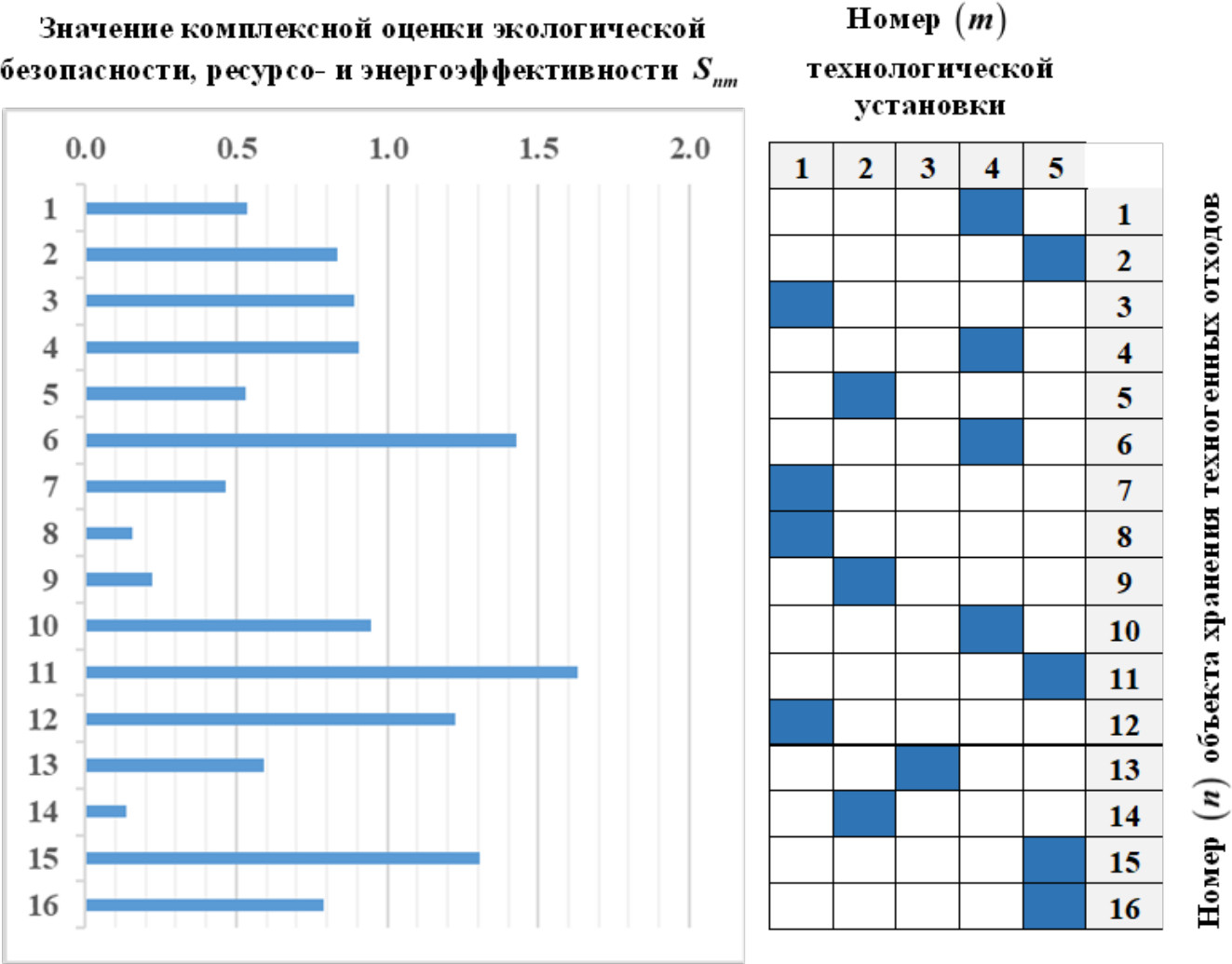 На основе подхода, описанного в [19], получены численные значения оценок экологической безопасности, ресурсо- и энергоэффективности технологий переработки ТО в каждом n-м из N хранилищ ТО с помощью каждой m-й из M технологических установок переработки. Кроме того, рассчитаны длительности переработки в каждом n-м из N хранилищ ТО с помощью каждой m-й из M технологических установок по следующей формуле: