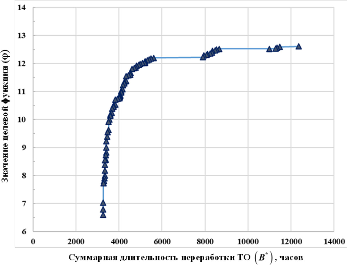 На рис. 2 представлено Парето-оптимальное множество решений сформулированной выше задачи многокритериальной оптимизации системы с целью переработки ТО за минимальное суммарное время работы (16) при максимальном значении критерия (7), полученное c помощью разработанного авторами программного обеспечения [22].