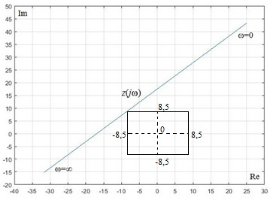 Из рис. 3 видно, что существует квадрат со сторонами, равными γϵ(0;5), вписанный в годограф z(jω); значит, семейства полиномов (21), (34) обладают робастной устойчивостью.