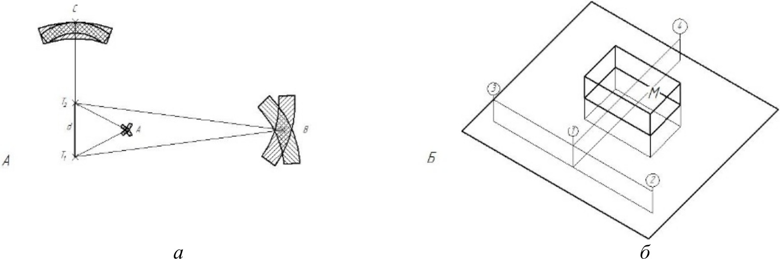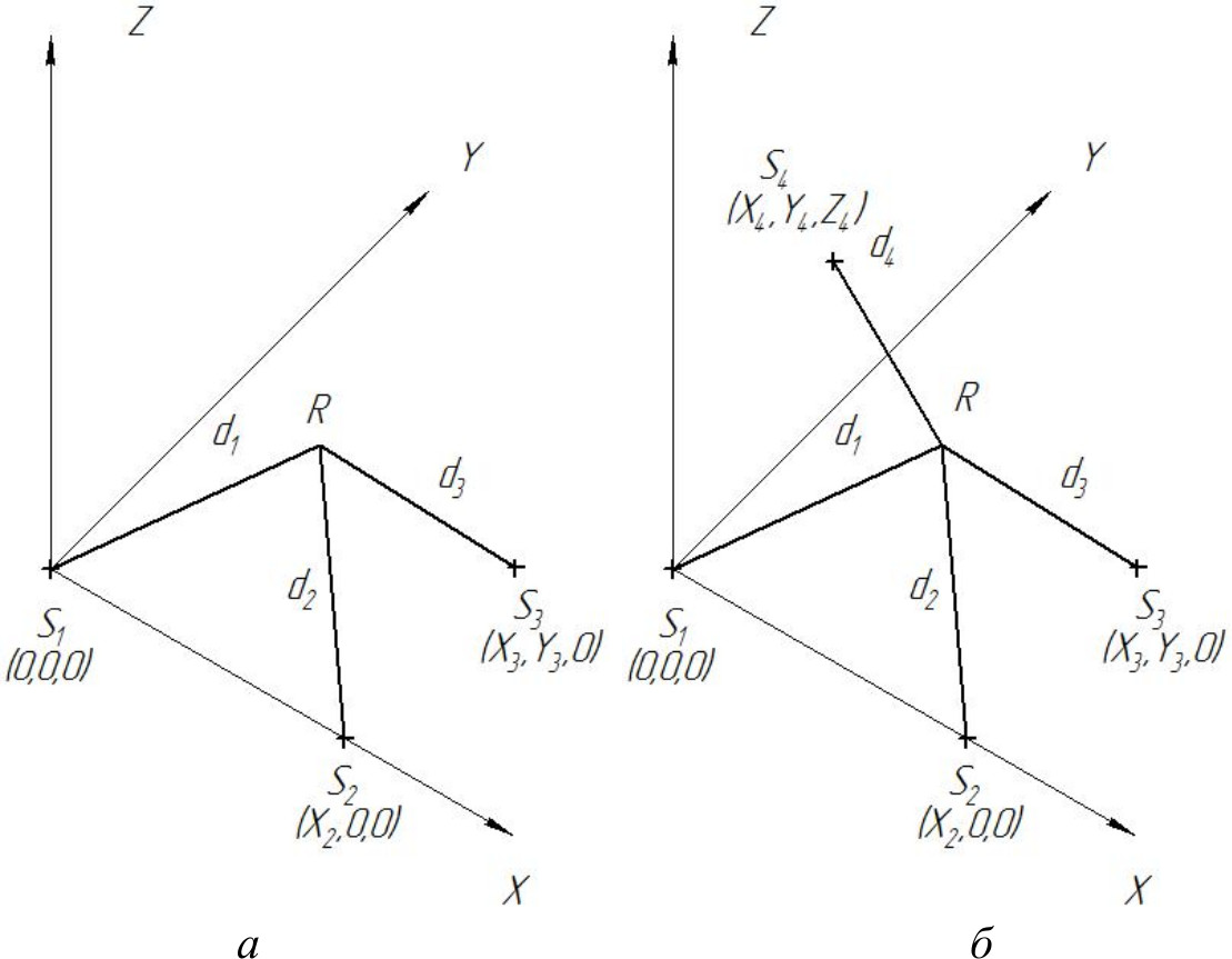 Рис. 2. Трилатерация (a); мультилатерация с четырьмя стоянками трекеров (б)